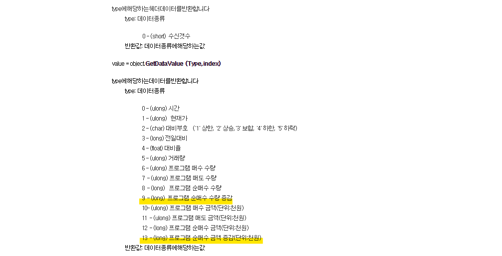 그나마 대신증권 API에서 DsCbo1.CpSvrNew8119라는 API는 시간대별로 종목별 프로그램매매 추이 리스트를 알려주긴 합니다. 근데 조금 이상한 건 그냥 매도/매수 수량이 아니라 프로그램 매수/매도 수량 증감입니다.